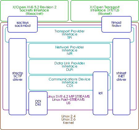 ComponentsThe Linux Data Link product provides a Data Link Provider Interface (DLPI) for Linux network interfaces as well as providing a Linux networking interface for STREAMS drivers supporting the Data Link Provider Interface (DLPI). The STREAMS INET product provides STREAMS based TCP/IP protocol suite for Linux Fast-STREAMS. The STREAMS SCTP project will provide STREAMS based SCTP protocol stack for Linux Fast-STREAMS. The STREAMS product provides a high-performance, production replacement for Linux STREAMS (LiS), called Linux Fast-STREAMS, or LfS, for short. OpenSS7 does not currently need any specific kernel projects other than STREAMS and the various drivers and modules. InterfacesTranport Layer Interface (TLI) Modules (timod, tirdwr) The STREAMS Transport Layer Interface (TLI) product provides an SVR 4.2 compliant TLI interface library, and a cooperating set of timod(4) and tirdwr(4) modules. The STREAMS X/Open Transport Interface (XTI) product provides an XNS 5.2 compliant XTI interface library, and a cooperating set of timod(4) and tirdwr(4) modules. Socket System Driver (socksys) and Module (sockmod) The STREAMS Socket System product provides an SVR 4.2 compliant socket system interface for Linux Fast-STREAMS. The STREAMS Sockets product provides an XNS 5.2, POSIX/SUSv3 compliant sockets interface to Streams supporting the Transport Provider Interface (TPI). STREAMS DDI/DKI Compatibility (strcompat) Modules The STREAMS compatibility modules product provides STREAMS DDI/DKI interface compatibility for most major UNIX STREAMS implementations, including AIX, HPUX, IRIX, LfS, LiS, MacOT, OSF/1, SVR 3.2, SVR 4.2, and UnixWare. | |||||||||||||||||||||